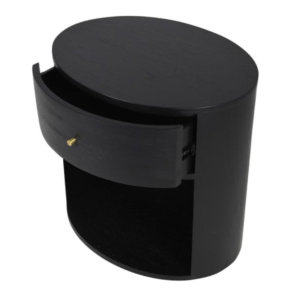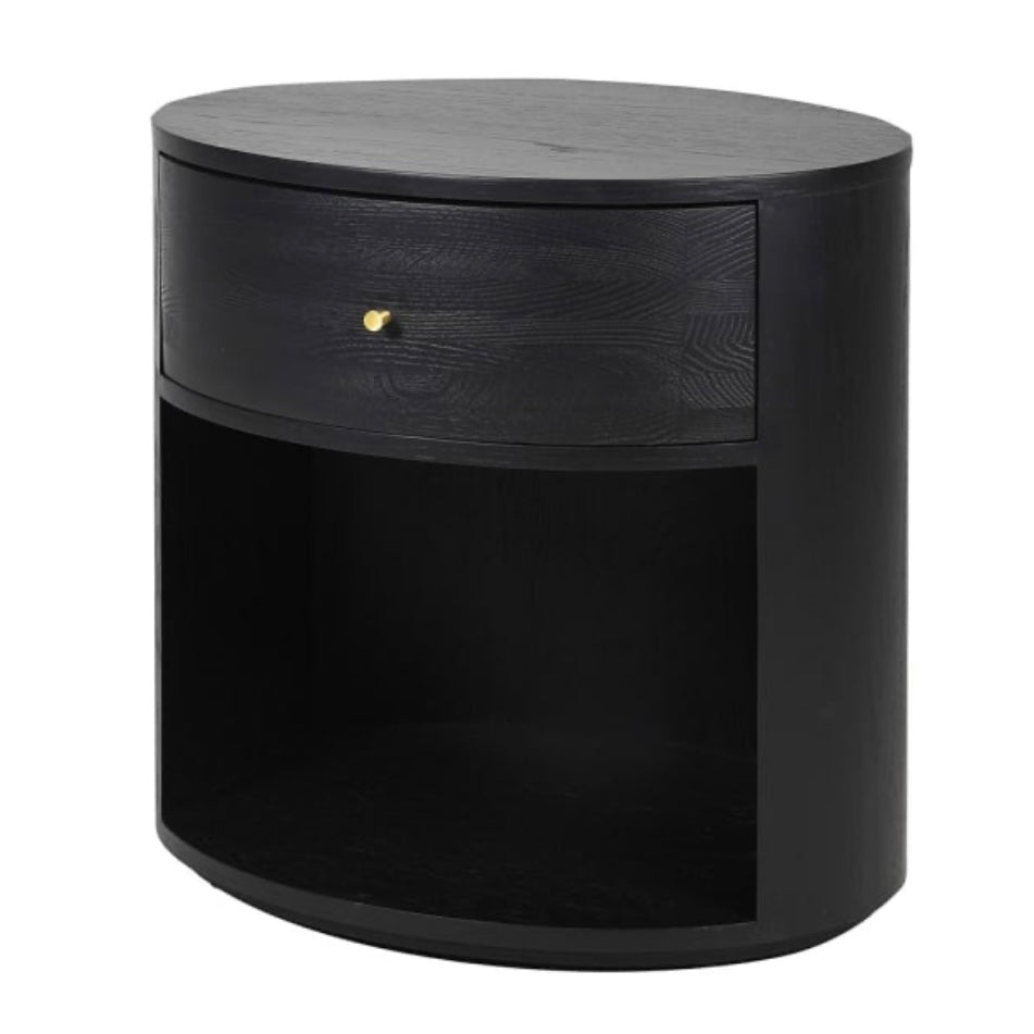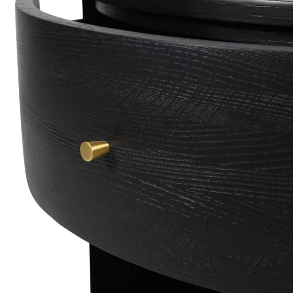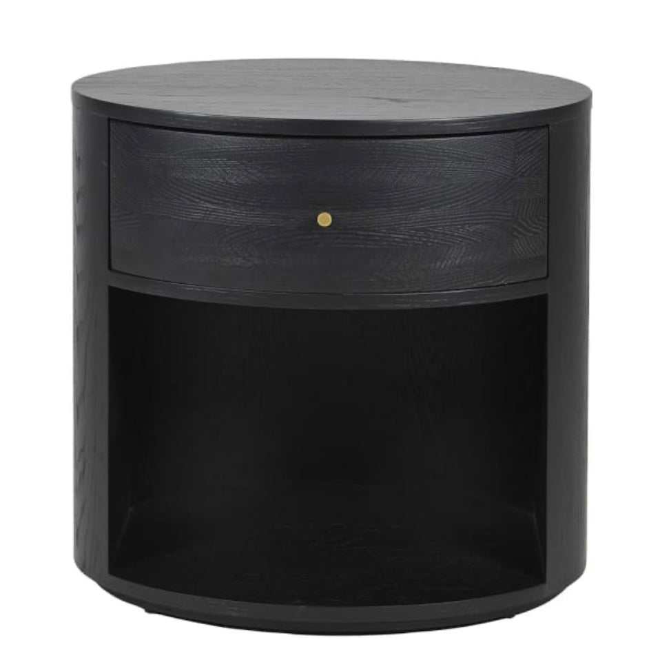 Elevate your living space with the striking Black Oak Cylinder Side Table. Crafted with a smooth cylindrical silhouette, this side table features a single curved drawer with a subtle brass knob and an open lower shelf for additional storage or styling space. The rich black oak finish highlights the natural grain of the wood, bringing depth and sophistication to any room.