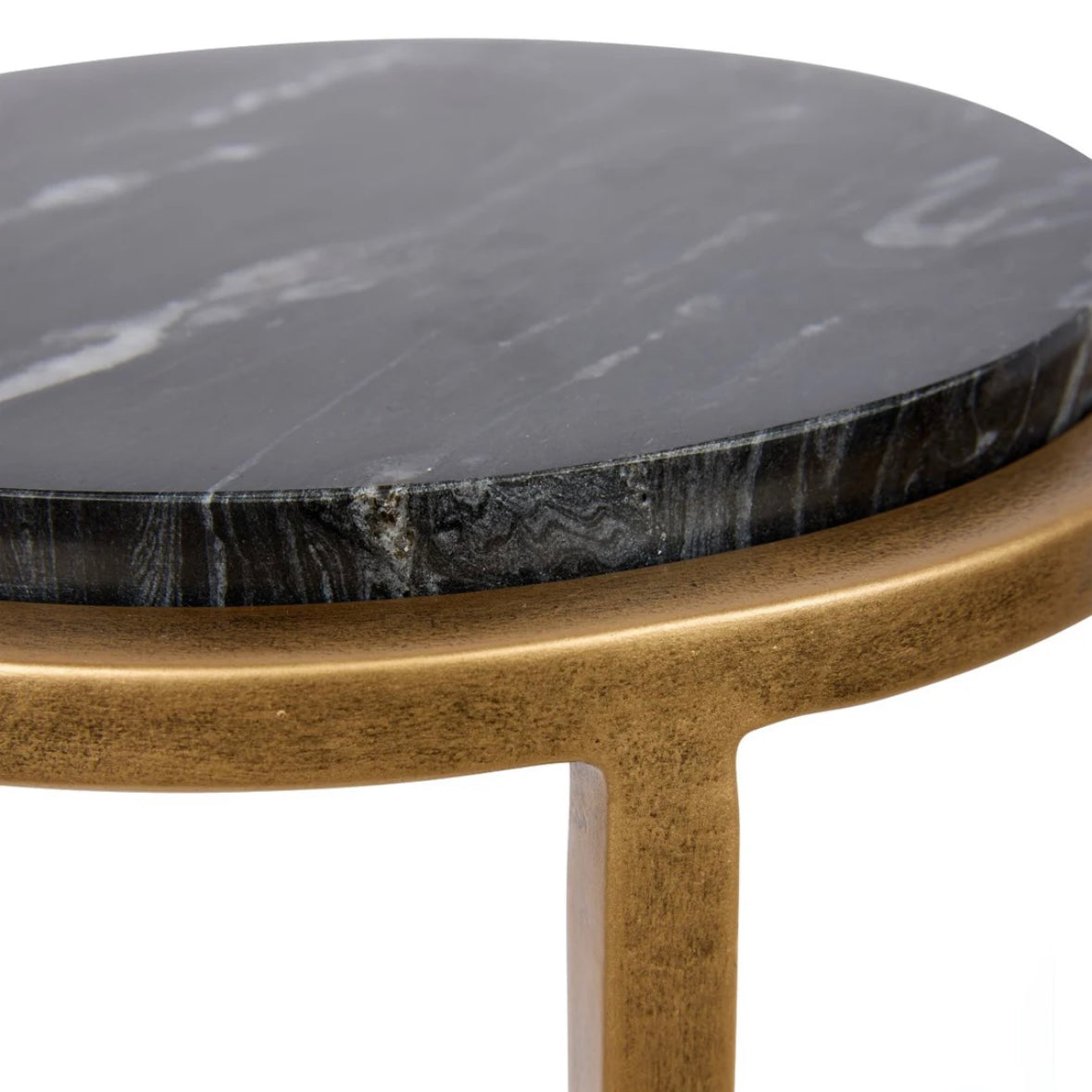 Compact, chic, and effortlessly elegant, this bkack Marble & Bronze Side Table is the perfect companion to your sofa or accent chair. Featuring a rich, veined marble top and a sleek bronze-finished metal frame, this C-shaped design effortlessly slides under furniture for convenient use without compromising on style.